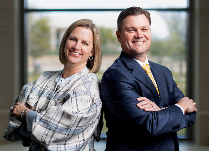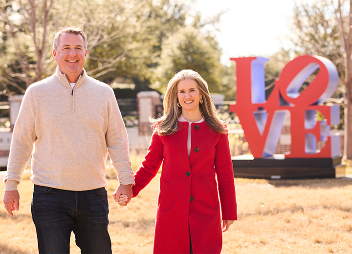 Rachel ’94 and Ross Morgan ’94, childhood friends turned lifelong soulmates, show their love for Texas A&M University.